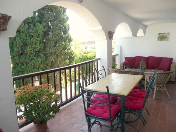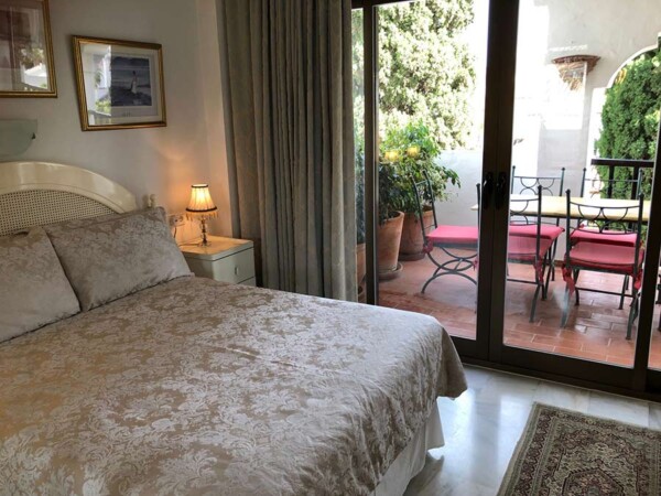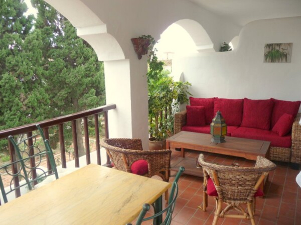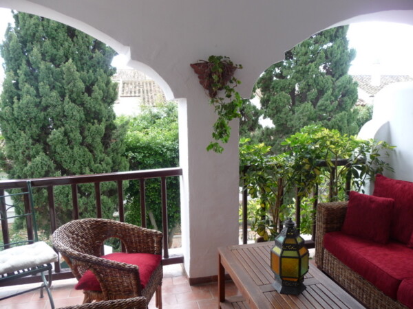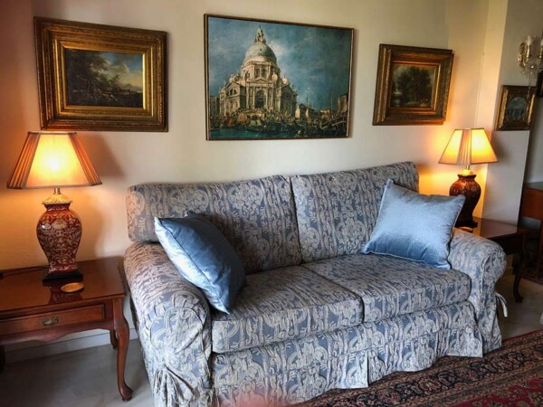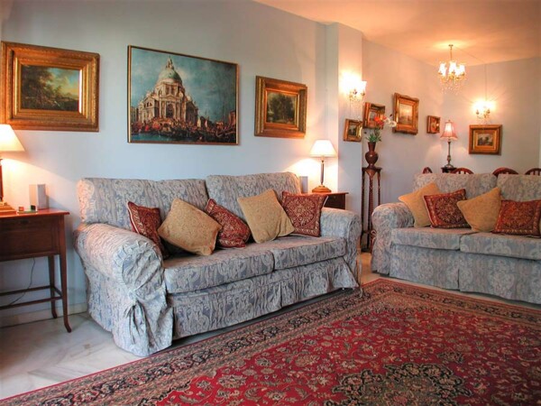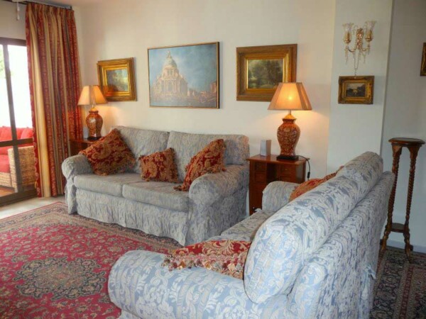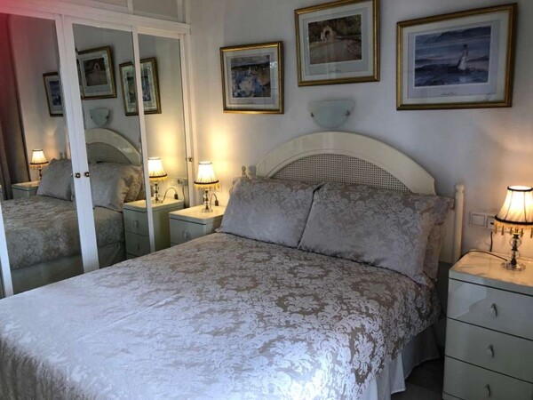 This is a beautiful apartment with air conditioning and free WiFi in the exclusive private estate of PUEBLA LUCIA, central FUENGIROLA. The elegant living/dining room leads out onto a large balcony overlooking the tranquil gardens of Puebla Lucia. It is beautifully furnished with two comfortable sofas and dining furniture. Satellite television, dvd, radio and cd player.  Numerous dvds and cds.