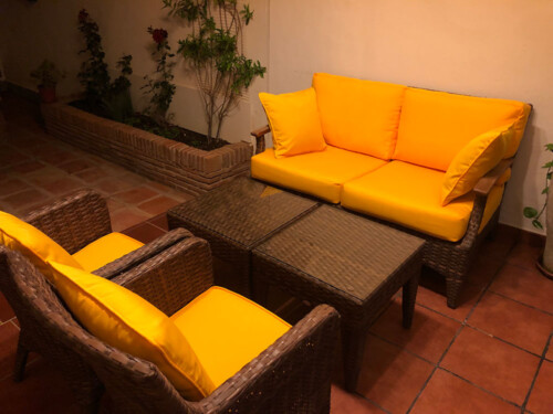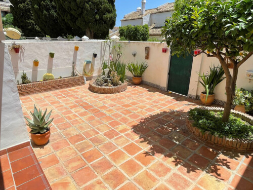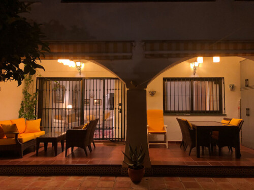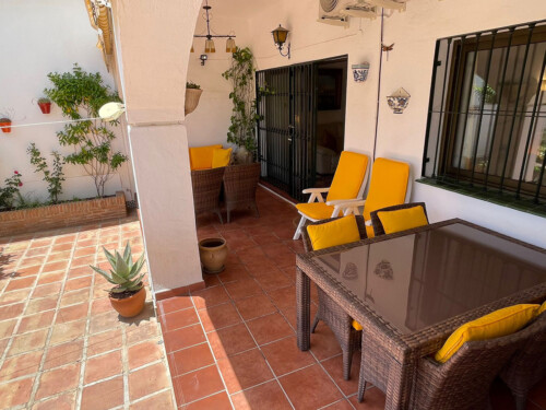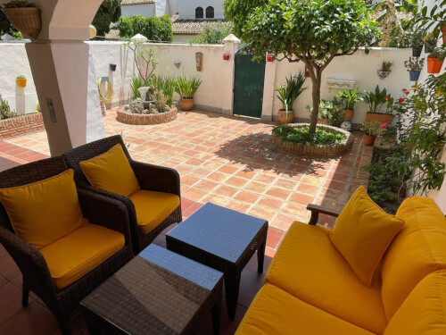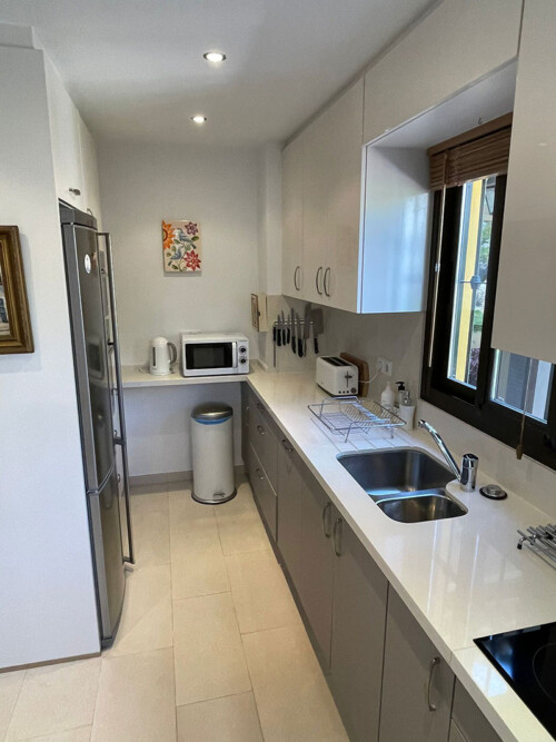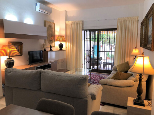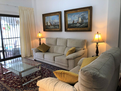 This is a beautiful ground floor garden apartment with air conditioning and free wi-fi in the exclusive private estate of PUEBLA LUCIA central FUENGIROLA. The living room/dining room is beautifully furnished with two comfortable sofas, dining suite and furniture. Smart Television, DVD & CD player. This room leads out onto a large private courtyard/garden with comfortable seating area and outdoor dining furniture.